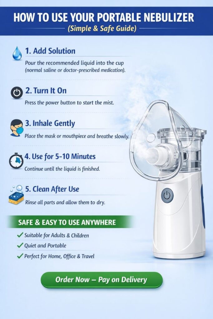 Compact nebulizer, easy to use and Great value for the money. It is rechargeable and compact, perfect for those who travel a lot. It comes with two mask sizes and a mouth piece and it is super quiet when in use. I was glad when i received the package and saw the pouch. The nebulizer is very light weight. The water doesn’t leak. Overall I would recommend this as a value for your money and easy to use.